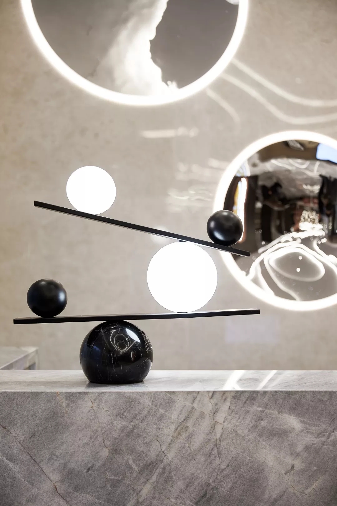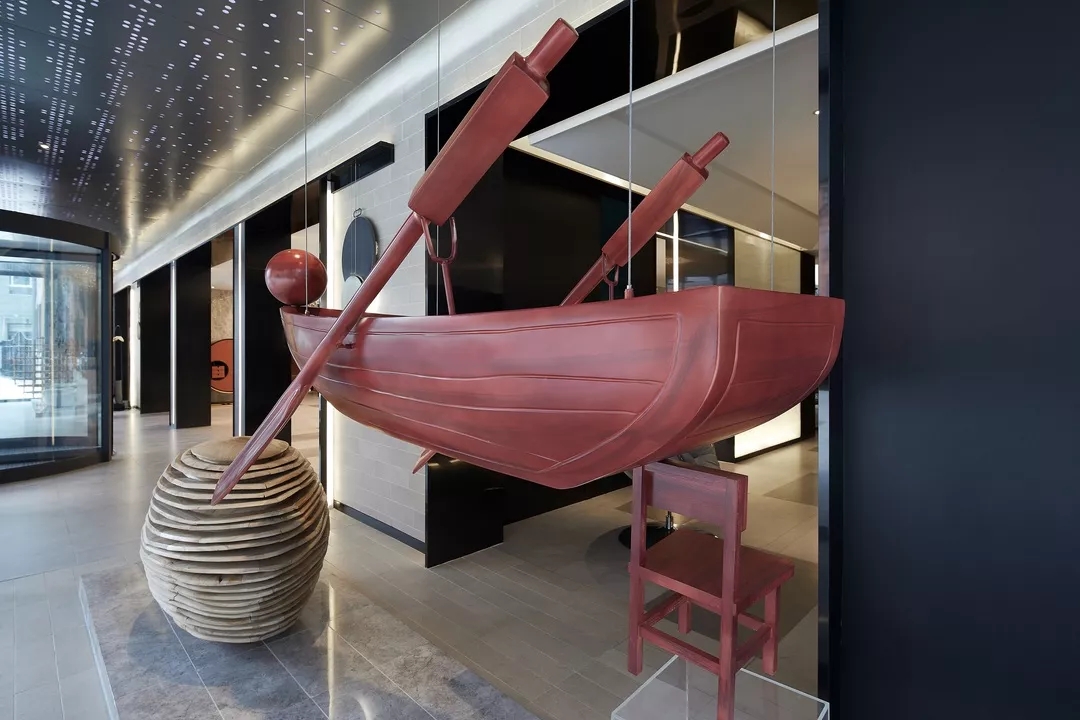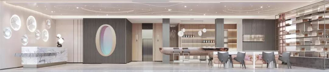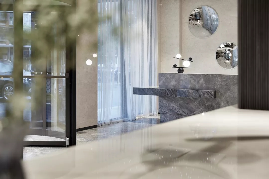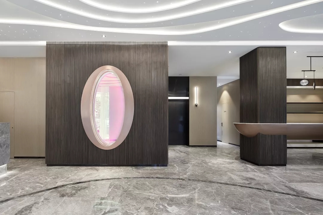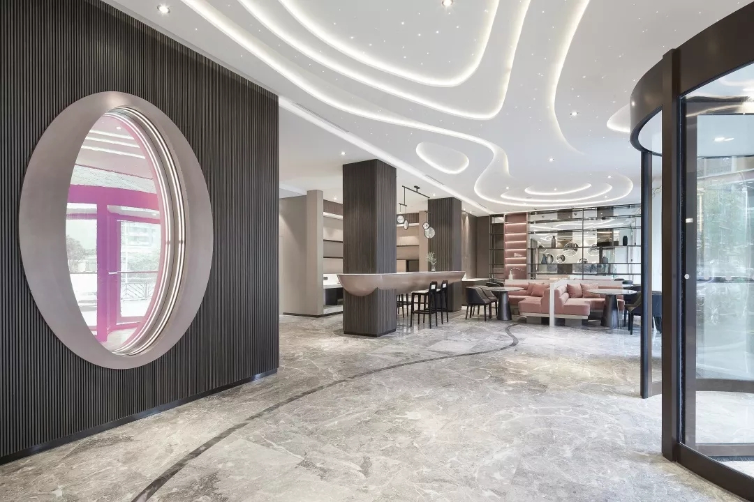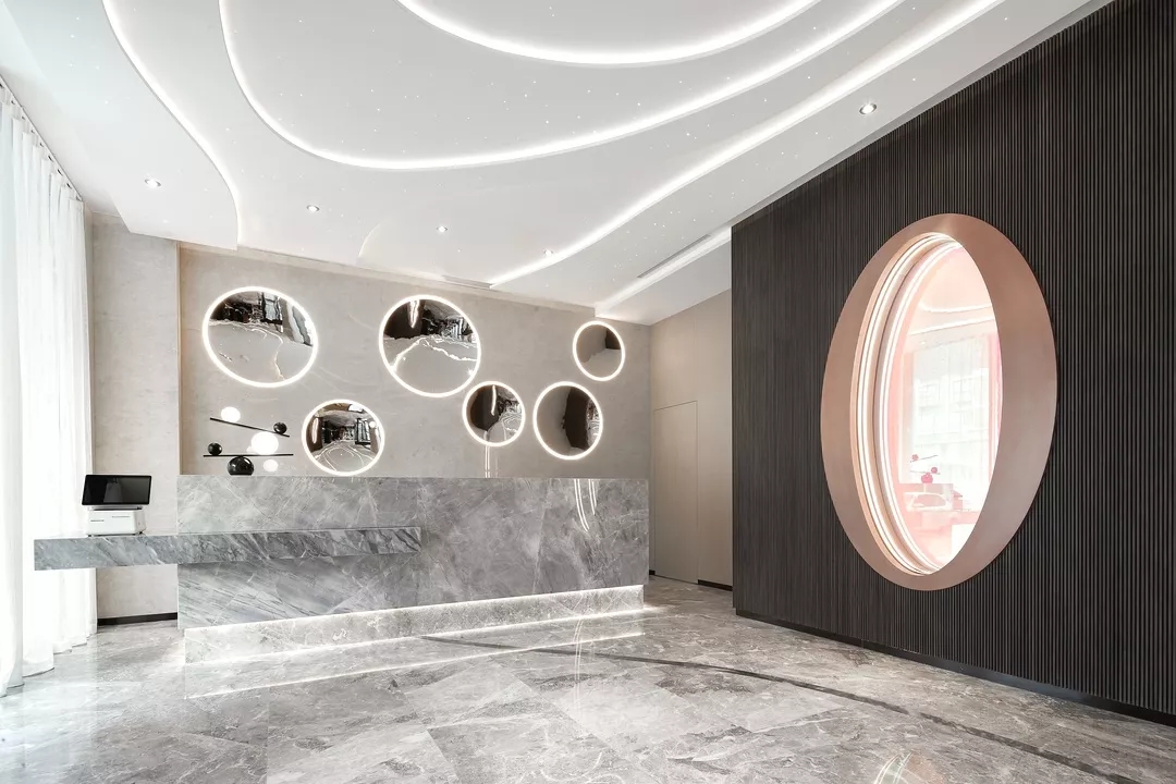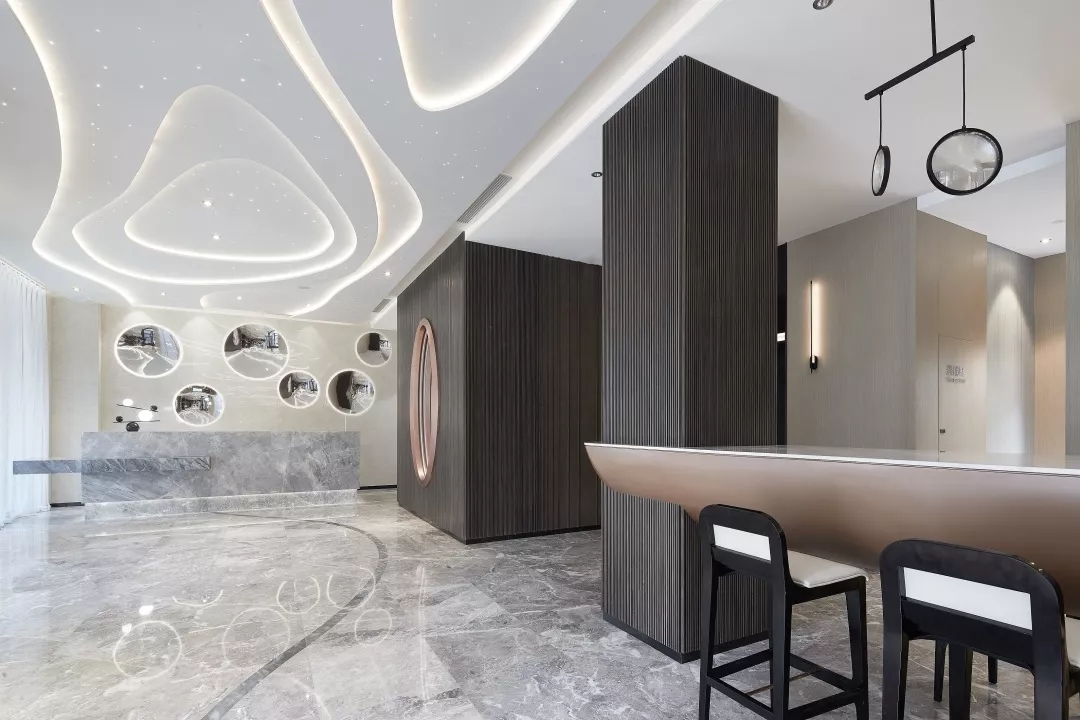 大堂前台背景墙用数个大小不同的金属凹面镜作为装饰,反射出倒影的虚体空间。犹如盗梦空间的维度,模糊了空间边界。