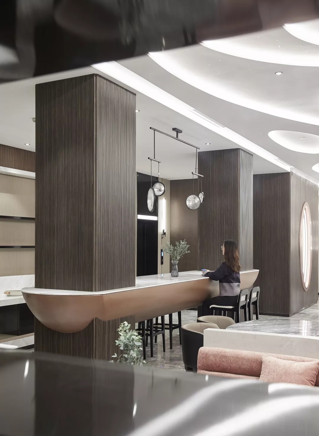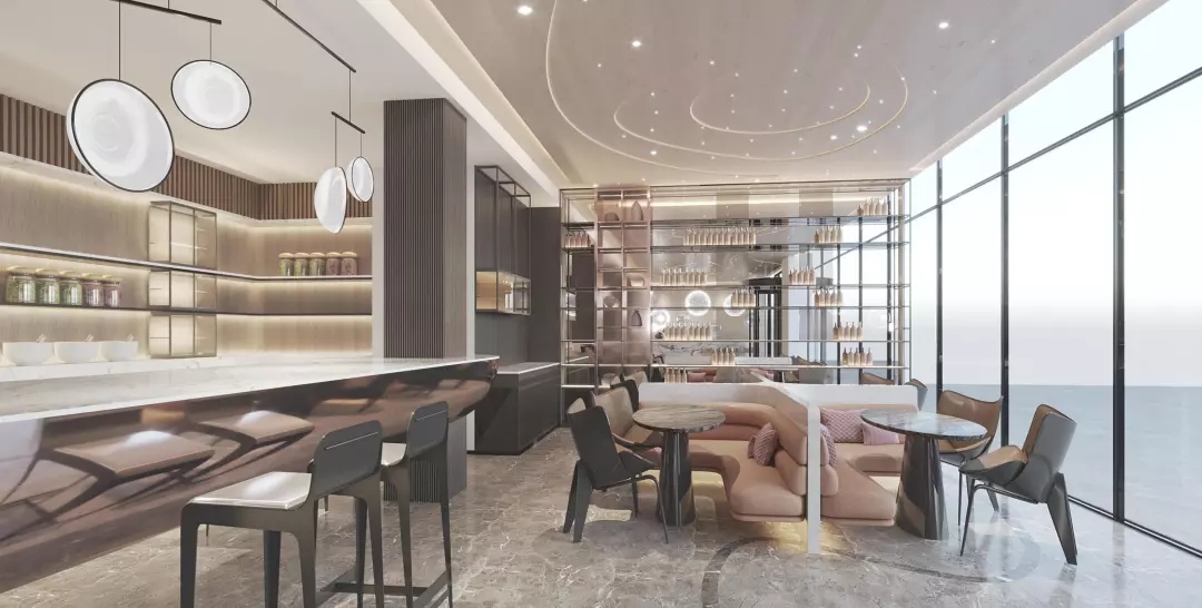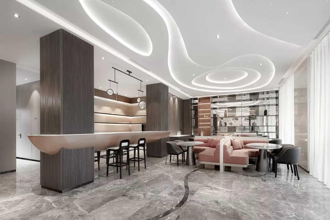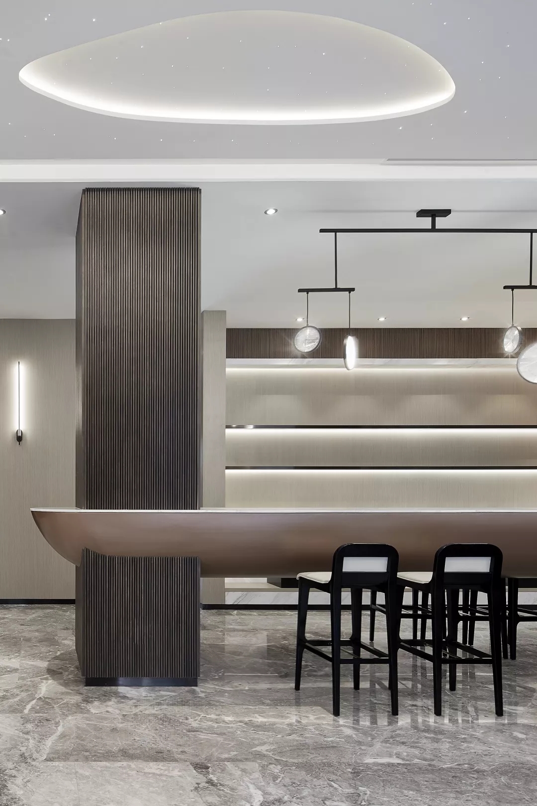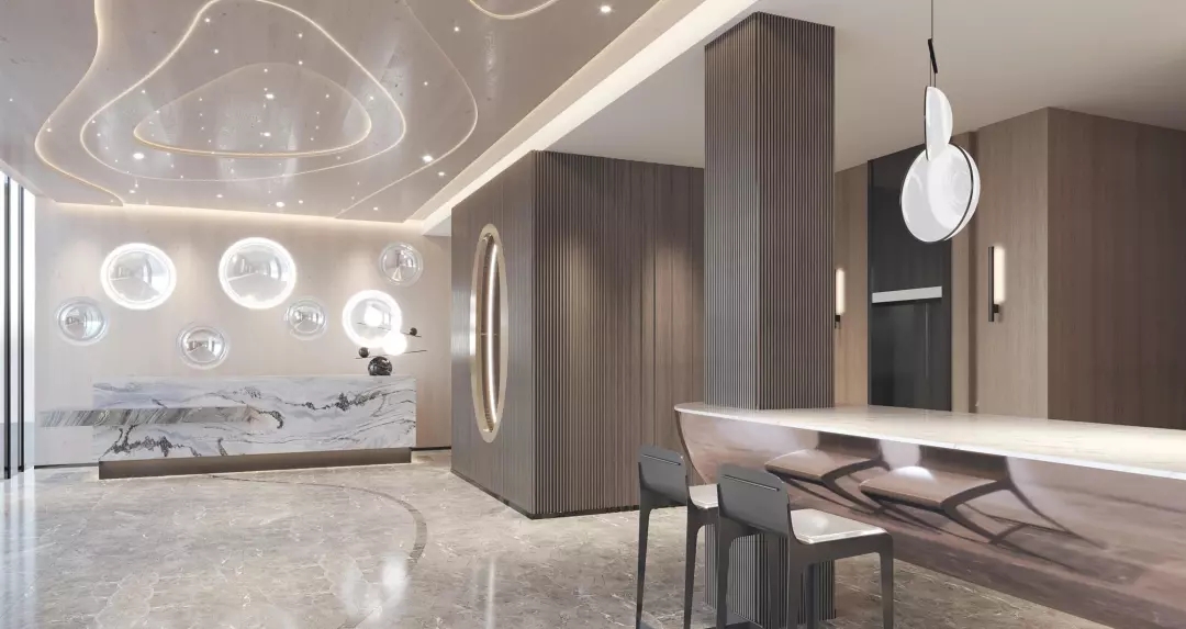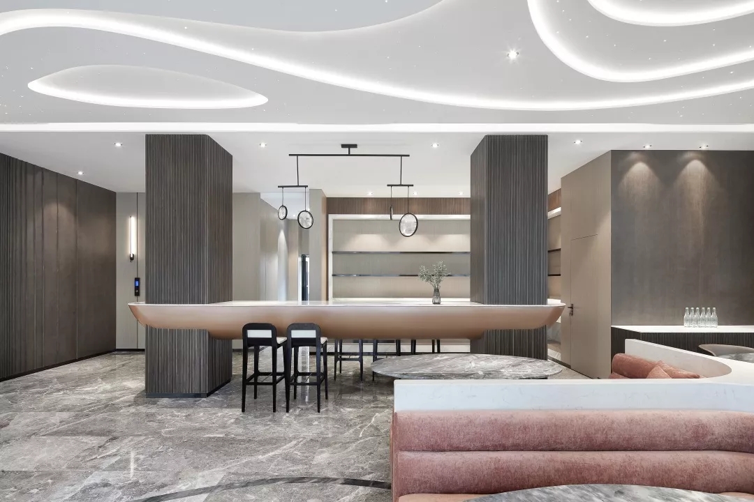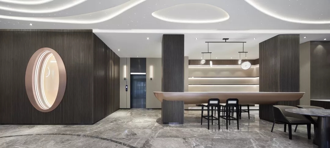 整个大堂空间顶部试图通过层叠、层次感隐喻无限的银河太空。光纤灯的星光点点以及星空轨迹的曲线线条灯光带给空间无限的科技感。同时墙面运用温暖质感的木饰面和暖色的金属材料营造出有温度的科技感。