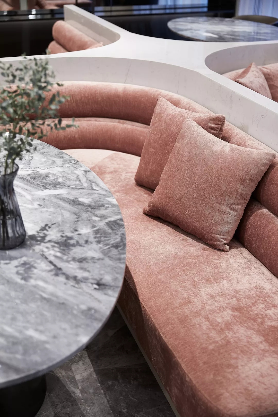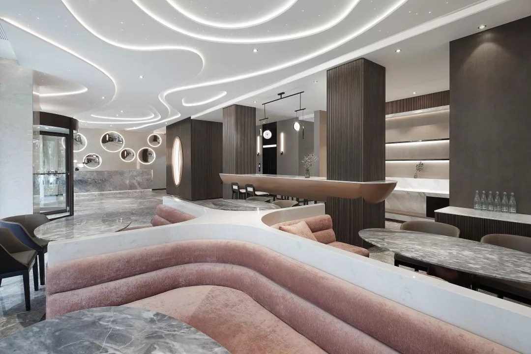 卡座采用十字造型,将座位划分为四个独立区域,并搭以杏粉色的面料,充满舒适感,满足休息区及早餐餐桌功能,更具艺术性与灵活性。