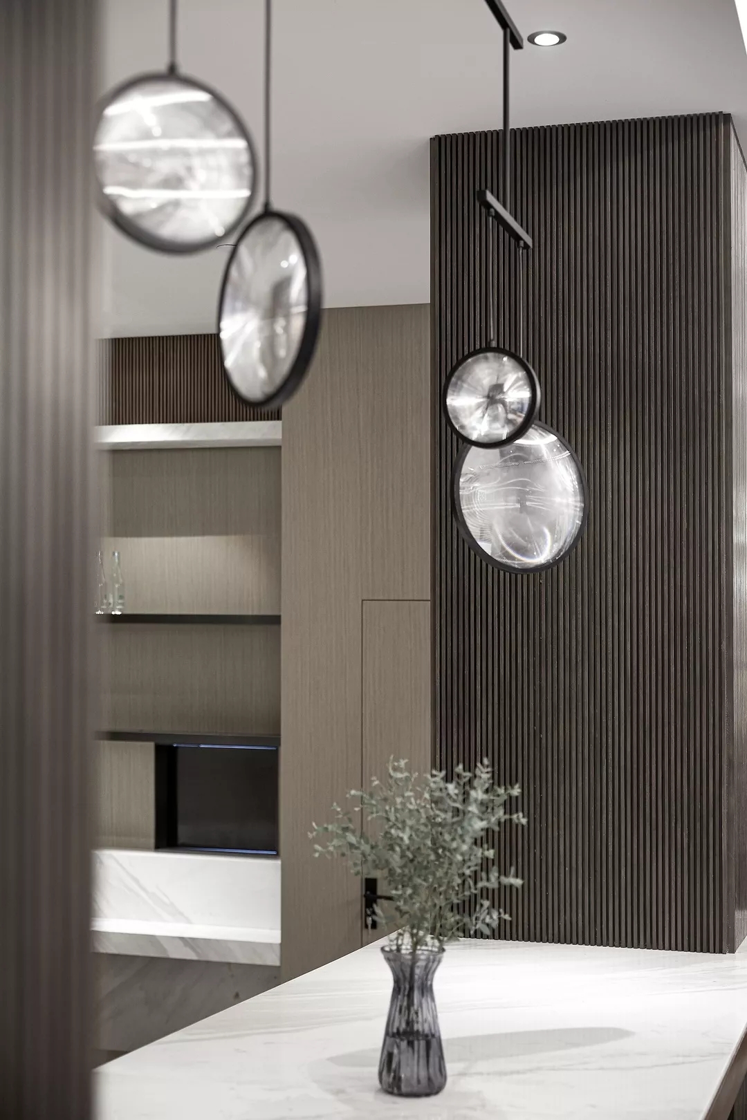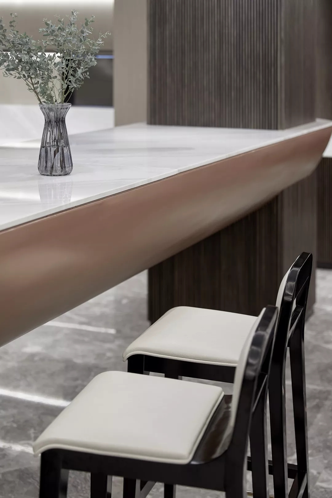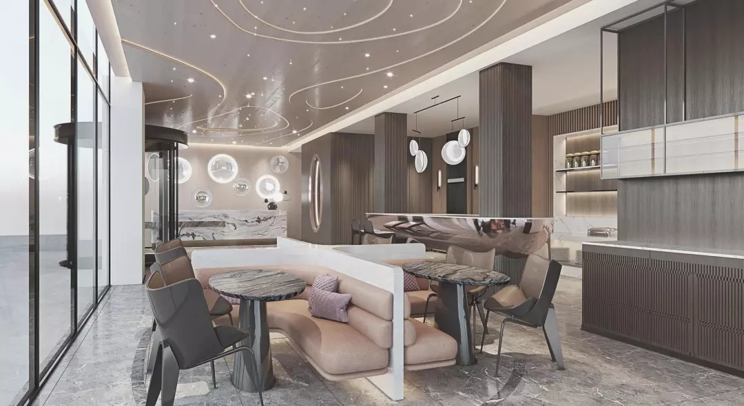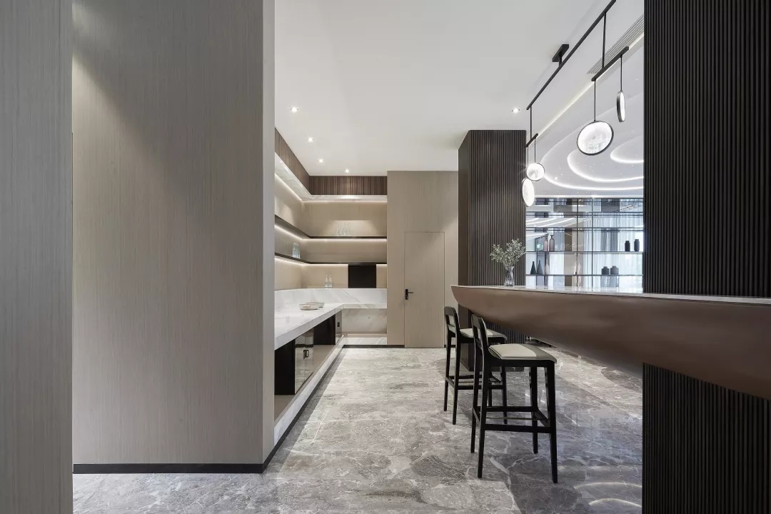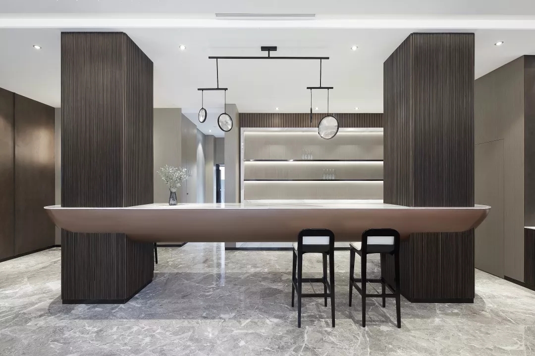 备餐台区域满足早餐厅功能的同时,在材料上通过金属材质来提升现代感,在造型上并结合柱子整体考虑。通过灯光的渲染,色彩的搭配呈现一个干净简洁的空间。