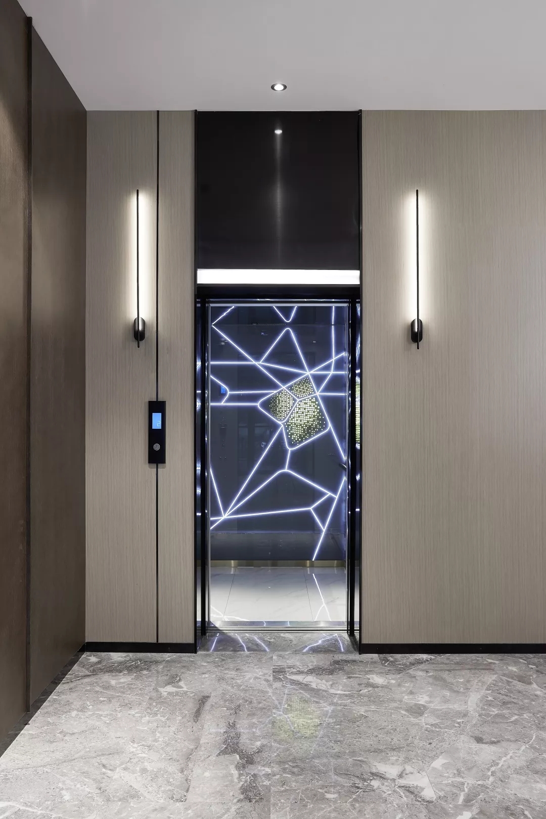 电梯厅立面采用未来感十足的精致线条壁灯,结合轿厢内网络交错的透光烤漆玻璃墙面,来延伸大堂线条感的设计。整体空间用灯光融合了线条的趣味性和视觉性,营造了未来科技感。