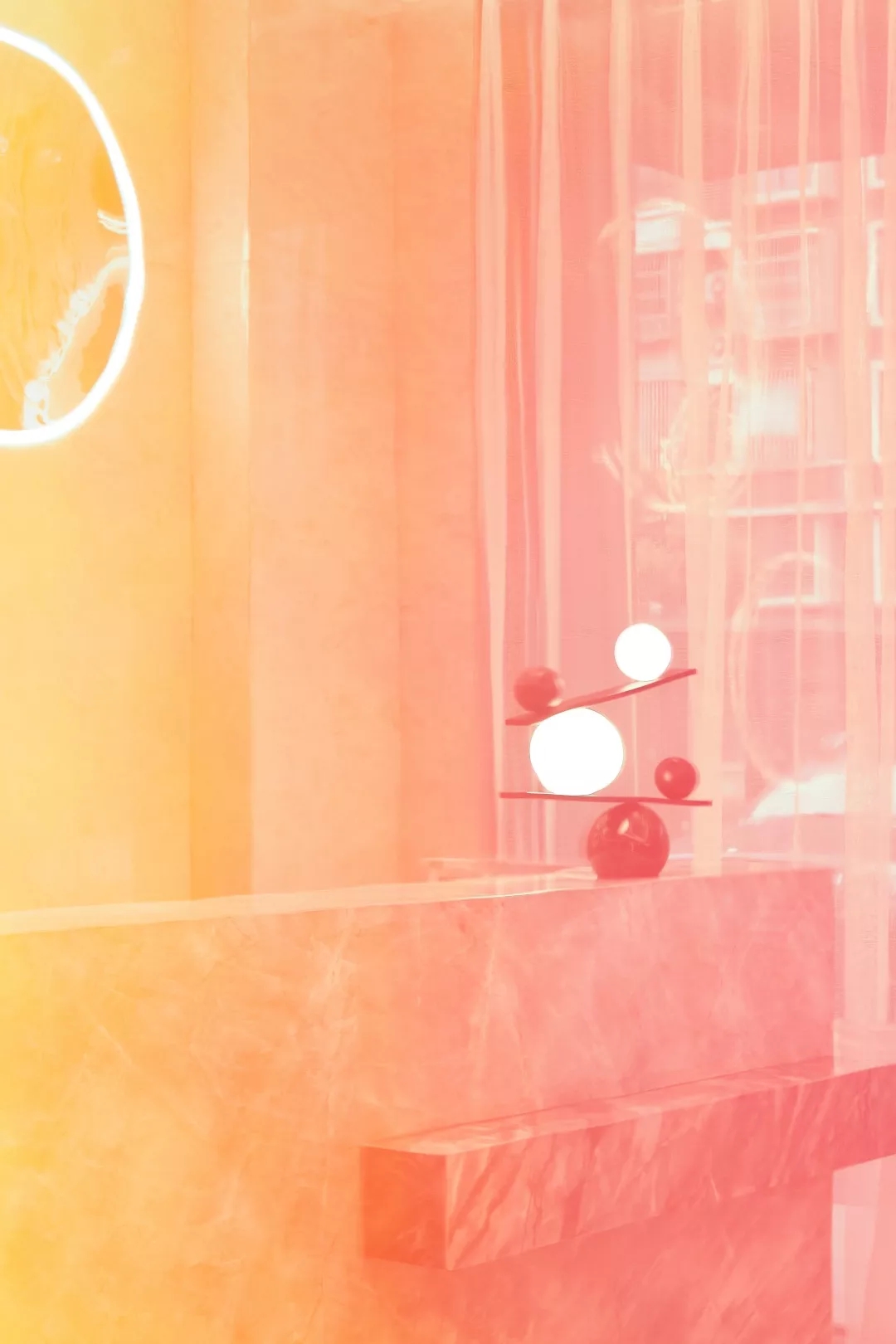 暖咖色木饰面竖向线条密拼由线构成面,底面用镜子加炫彩膜,侧面柔性灯带轮廓点亮。色彩镜面的重叠反射与折射构成一个无限的"O"字艺术装置,强化ORANGE HOTEL品牌识别度。墙面与天花、空间与色彩,折射与反射、虚与实的空间之中消融了边界。