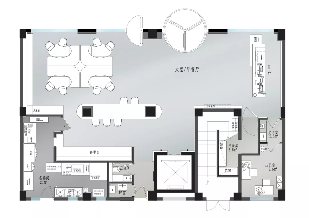 一层大堂区域同早餐厅共用,在空间布局上必须考虑大堂休息区兼做早餐座位区的功能性。醒目的大长桌造型结合了结构柱形成悬空效果,即增加了科技感又合理的优化了柱子的功能。从使用上和整体性上满足功能需求及艺术性。